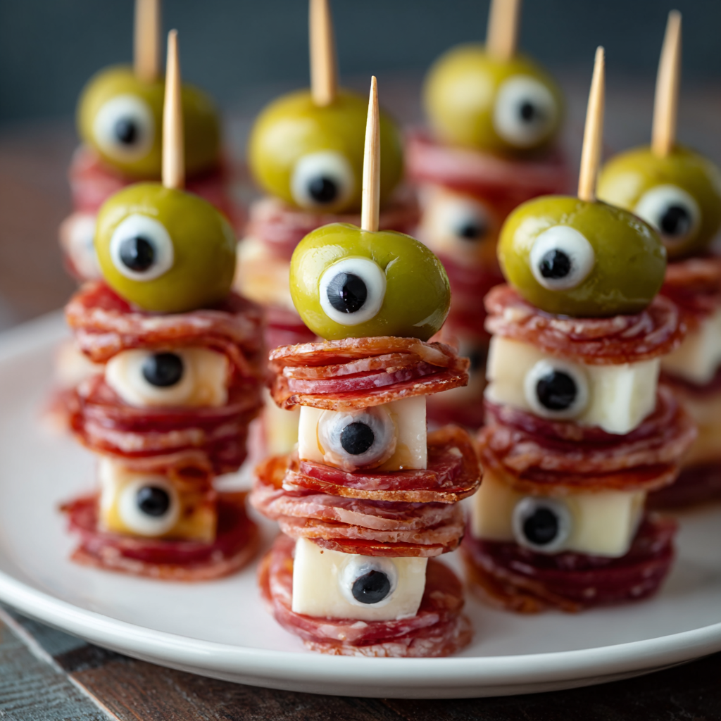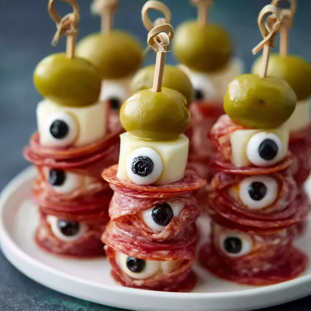 Think of these as spooky skewered charcuterie! To elevate the taste, alternate cheese, meats, and briny olives for a balance of salty, creamy, and tangy. You can even sneak in a basil leaf between layers for a pop of freshness — it adds aroma without disrupting the creepy aesthetic.