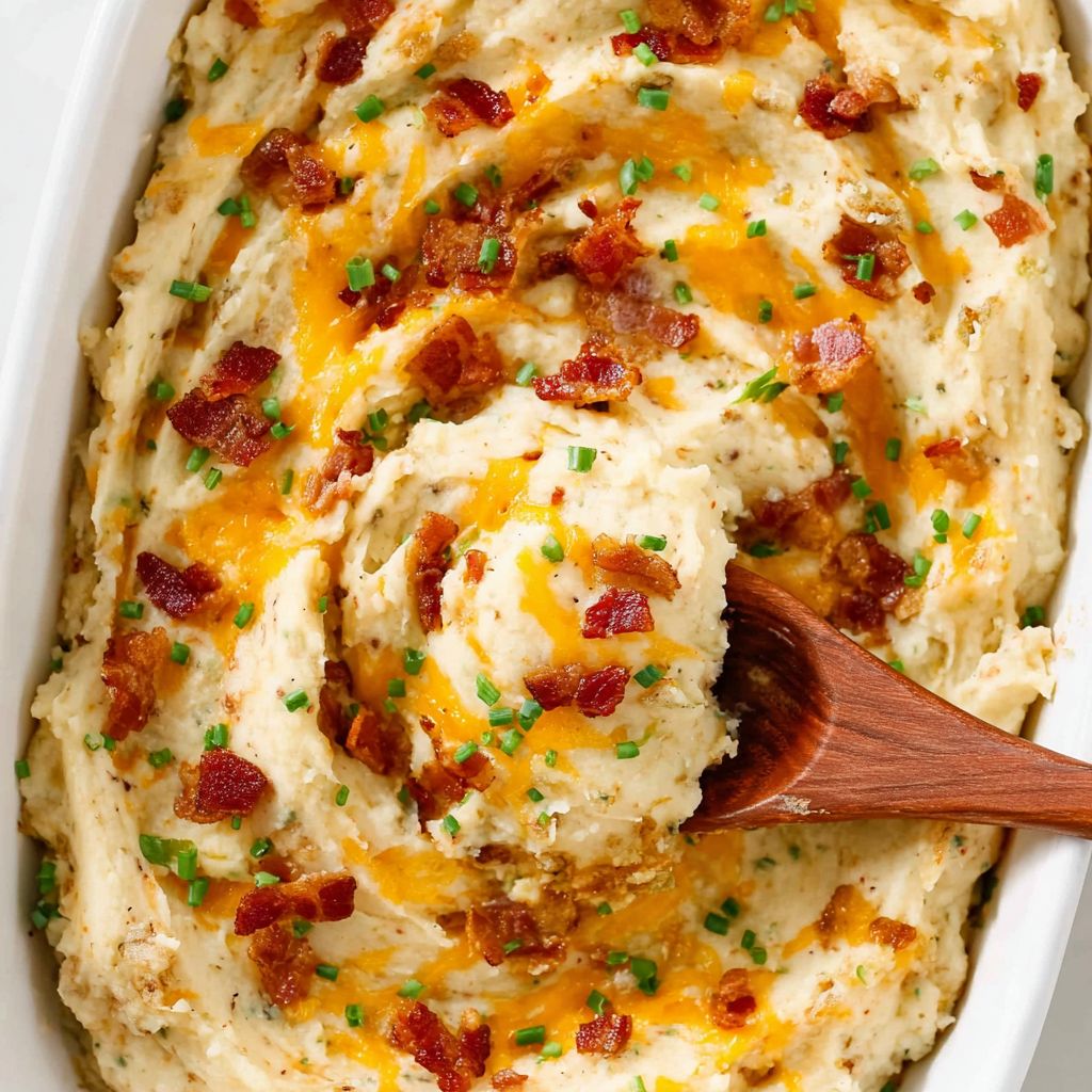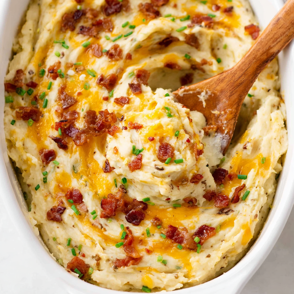 To make the recipe dairy-free or vegan, substitute all cheeses and butter with plant-based alternatives. Use unsweetened oat milk or broth to thin the mash and add vegan cheddar and cream cheese to replicate creaminess. Vegan bacon crumbles add crunch and smoky flavor, completing the loaded effect.