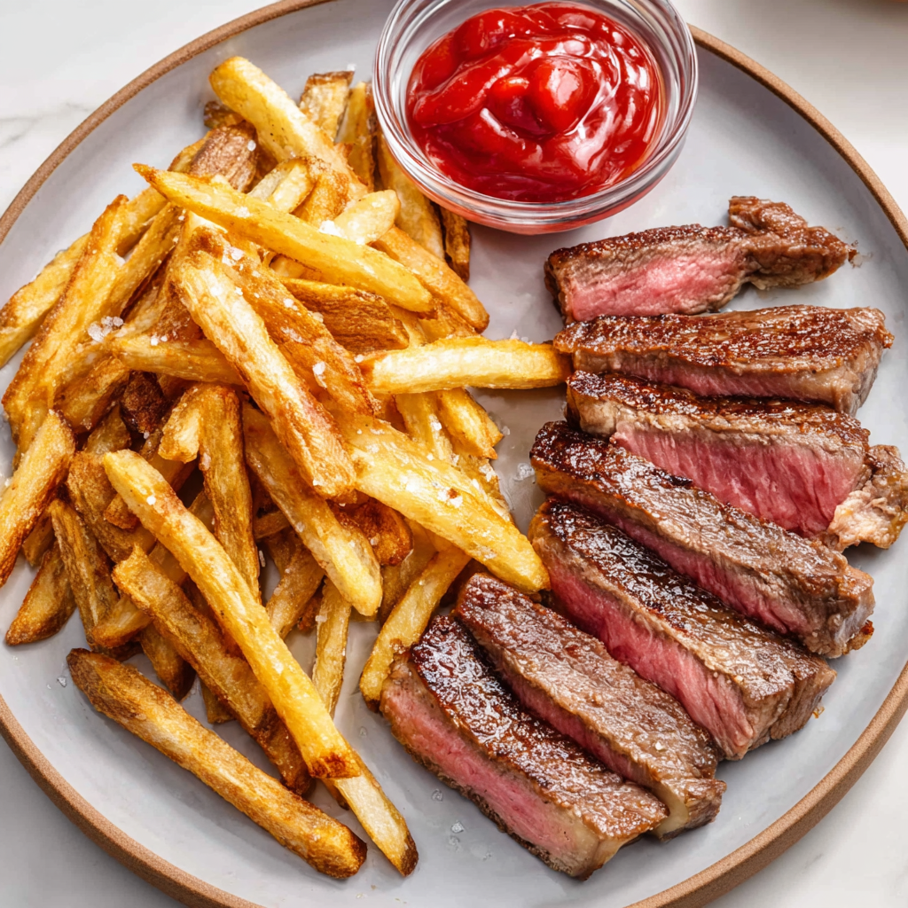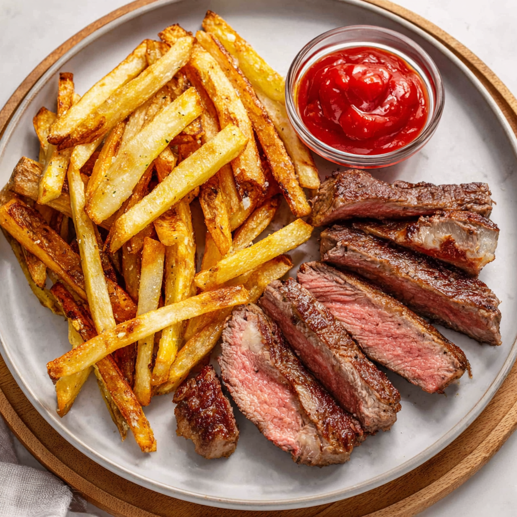 For a lighter version, oven-bake the fries at 450°F for 25–35 minutes, flipping halfway. They won’t be identical to double-fried potatoes but still become beautifully crisp. Choose a leaner steak cut like sirloin or strip loin. Use 1–2 tablespoons butter instead of 3 and supplement flavor with herbs or garlic.