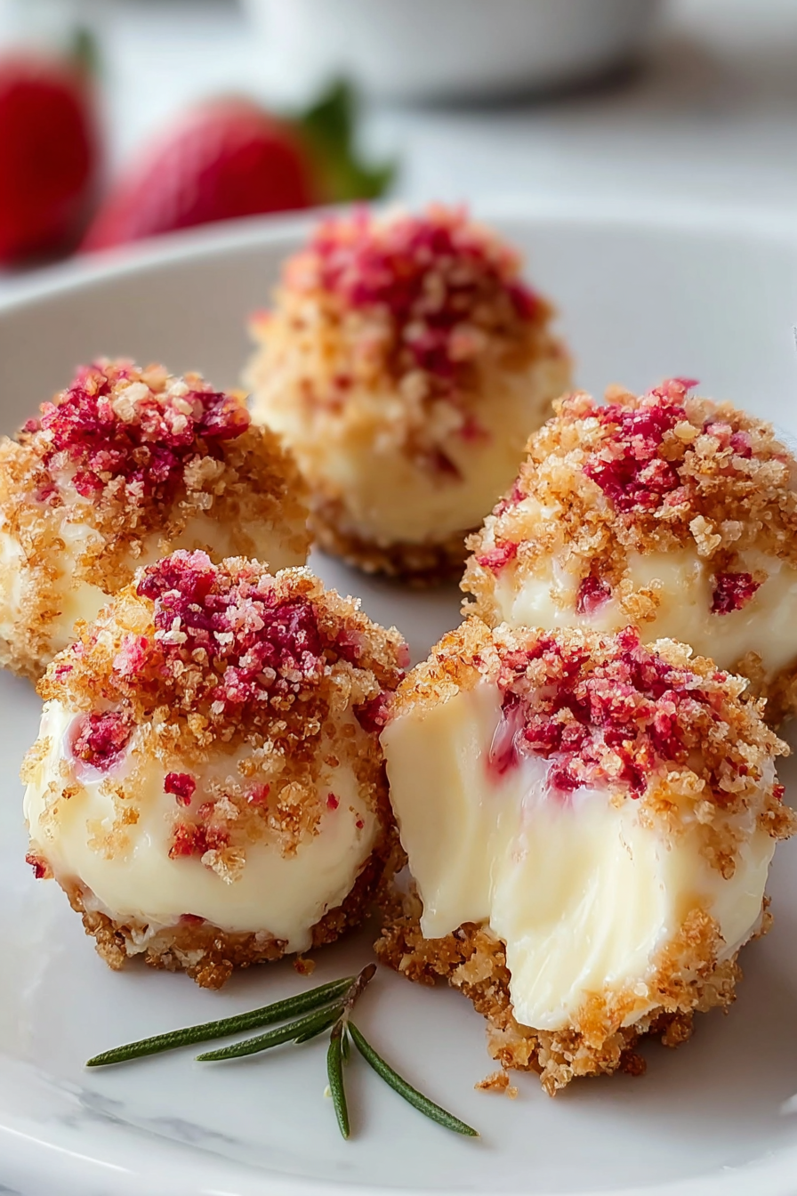 Finally, the strawberry crunch topping combines crushed golden cookies, freeze-dried strawberries, and a touch of melted butter to bind everything together. The result is a crunchy, fruity layer that makes each bite exciting and irresistibly good. This topping not only adds flavor but also brings a pop of color that makes the bites visually stunning on any dessert table.