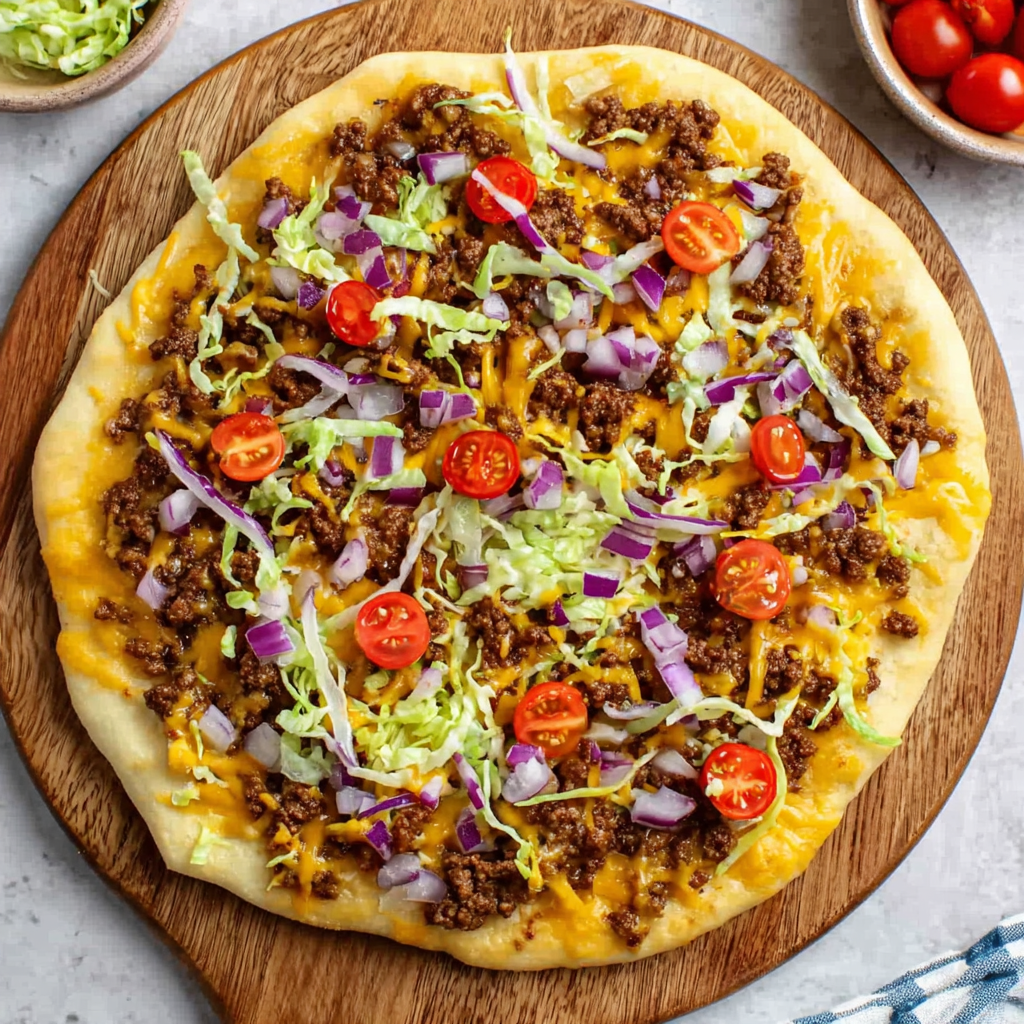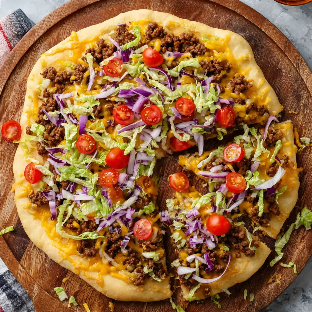 From its customizable nature to its playful fusion of flavors, Taco Pizza is more than just a meal—it’s an experience. Every slice offers the comforting warmth of melted cheese, the savory punch of seasoned beef, and the freshness of crisp veggies. It’s a recipe that brings people together, invites creativity, and makes mealtime exciting again. With its bold flavors, easy preparation, and crowd-pleasing appeal, this pizza is destined to become a favorite in your recipe rotation.