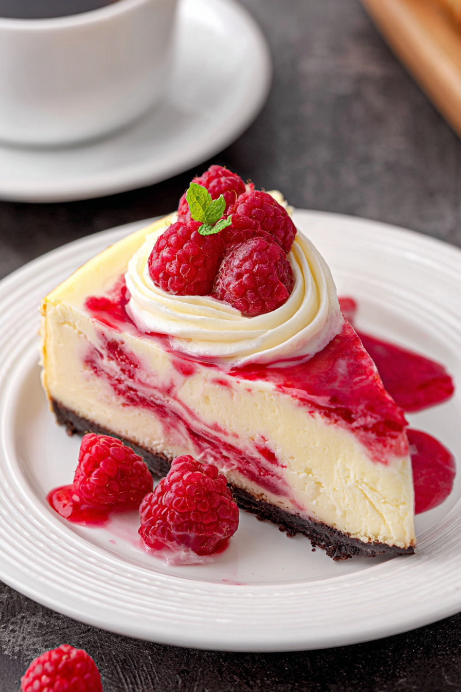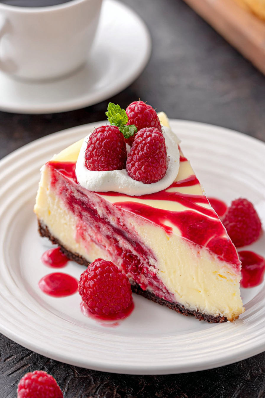 Once the cheesecake is fully chilled and set, carefully release the springform side. Slide a sharp knife around the edge if needed. Slice with a clean knife (dip in hot water and wipe between cuts for clean edges). Serve each slice with a drizzle of extra raspberry sauce, fresh raspberries, or a mint sprig. Let the cheesecake sit at room temperature for 10 minutes before serving for optimal texture.