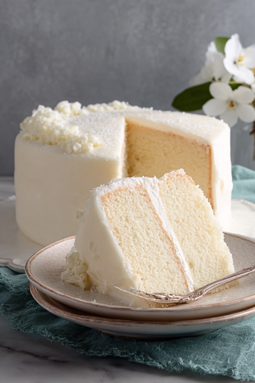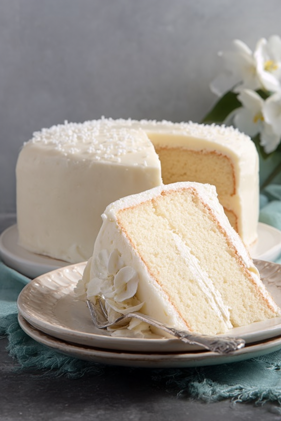 A soft, moist, and elegant cake with a tender crumb and delicate vanilla flavor. Perfect for weddings, birthdays, or any celebration.